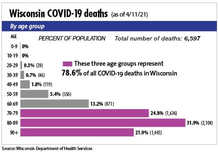 As of March 20, there were 6,576 deaths from COVID-19 in Wisconsin, according to data from the state Department of Health Services (DHS). Nearly eight in 10 were people 70 and older. More than half were at least 80, and more than a fifth were 90 and older.