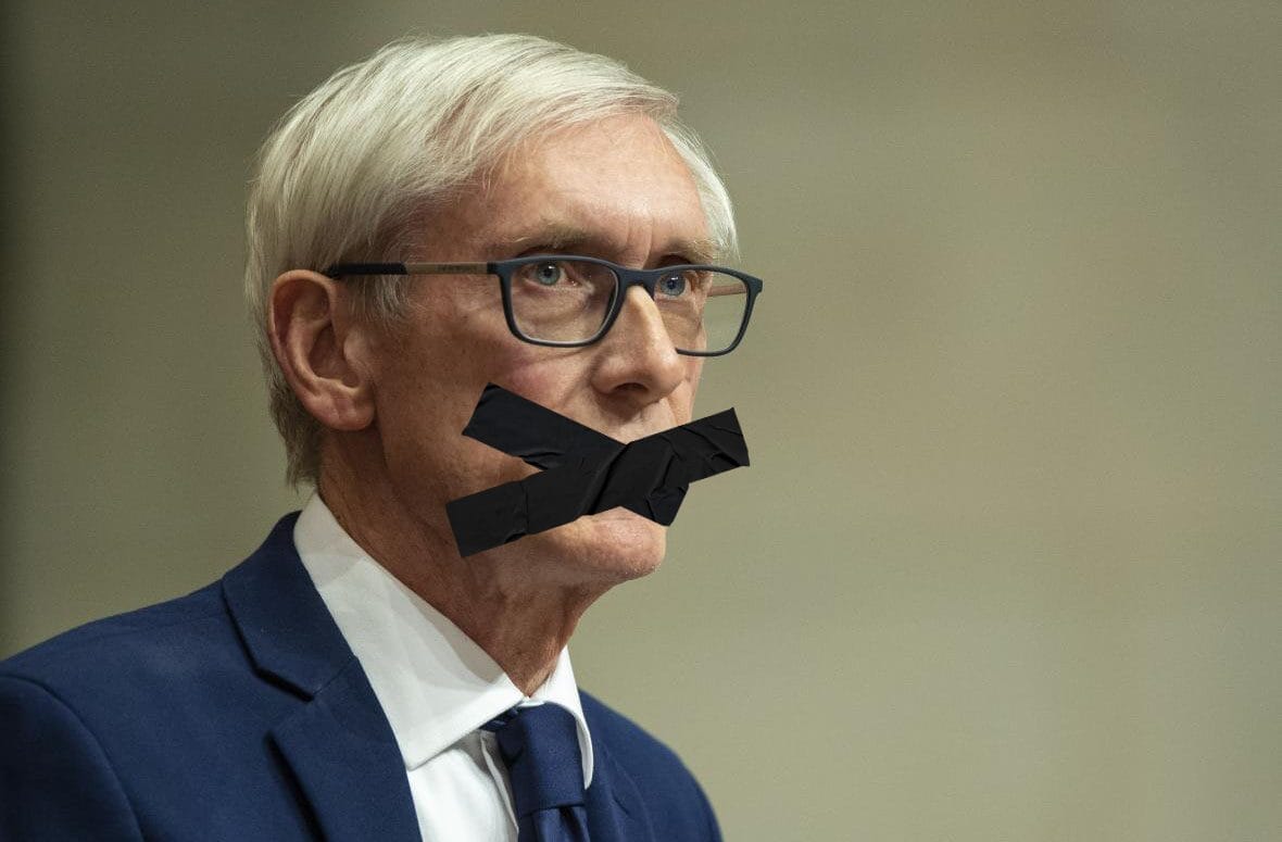 Wisconsin Governor Tony Evers, superimposed with tape over mouth to indicate silence regarding Milwaukee Public Schools’ financial debacles