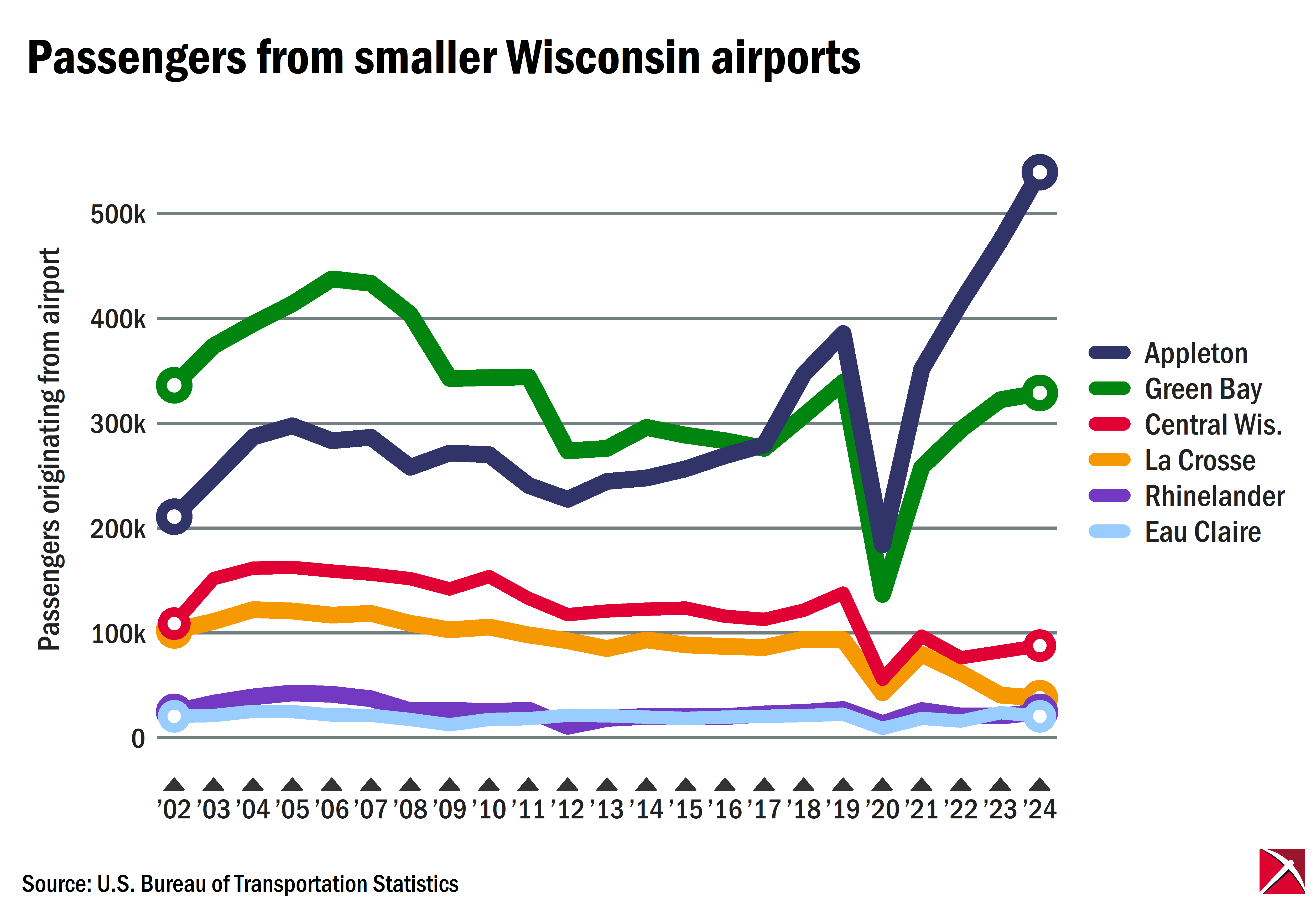 For smaller regional airports in the state, the story was much the same: Central Wisconsin airport between Wausau and Stevens Point, as well as airports in Green Bay, La Crosse, Rhinelander and Eau Claire were all still below their pre-pandemic levels.