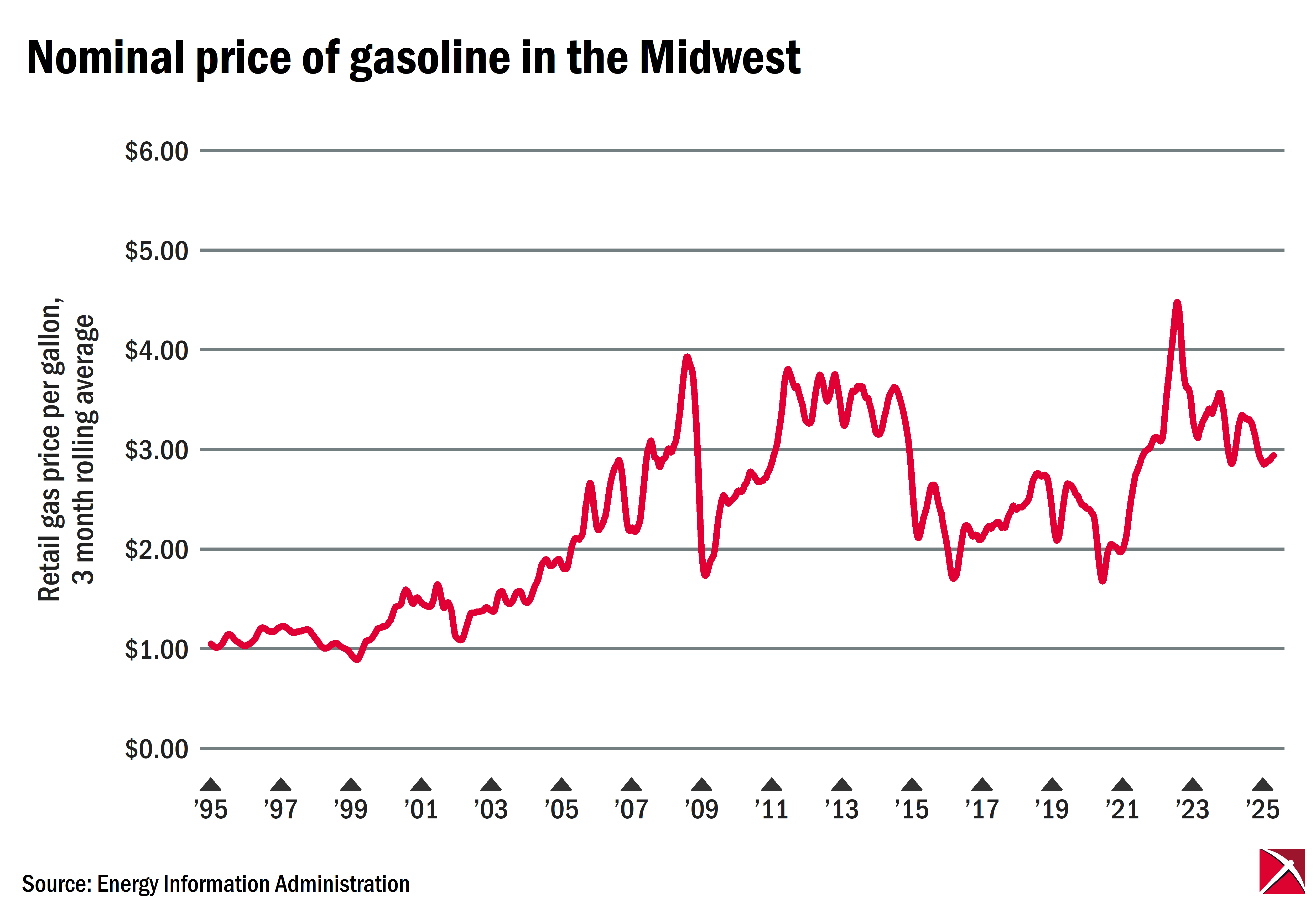 In nominal terms, the highest three-month rolling average price recorded for the Midwest during the period from 1995 to the present was $4.48 in July 2022. The average price has fallen cyclically since, dropping below the $3 mark in January 2024, and again in November of that year. The most recent figure for which data were available at deadline was from the last week of April, when the rolling average price was $2.94 per gallon.
