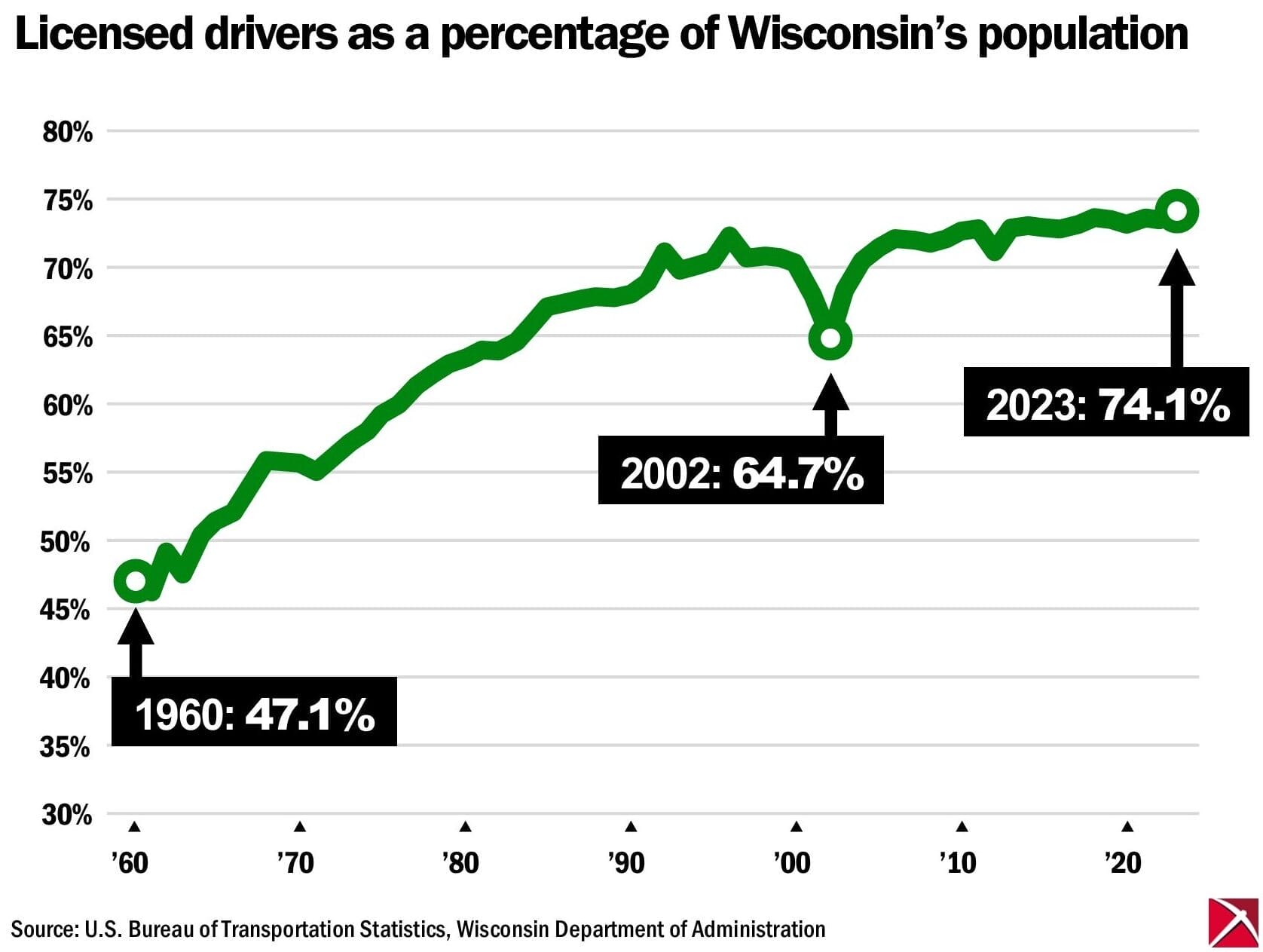 As a result, the percentage of Wisconsin’s population that is licensed to drive has increased sharply — from 47 percent in 1960 to an all-time high of 74.1 percent in 2023.
