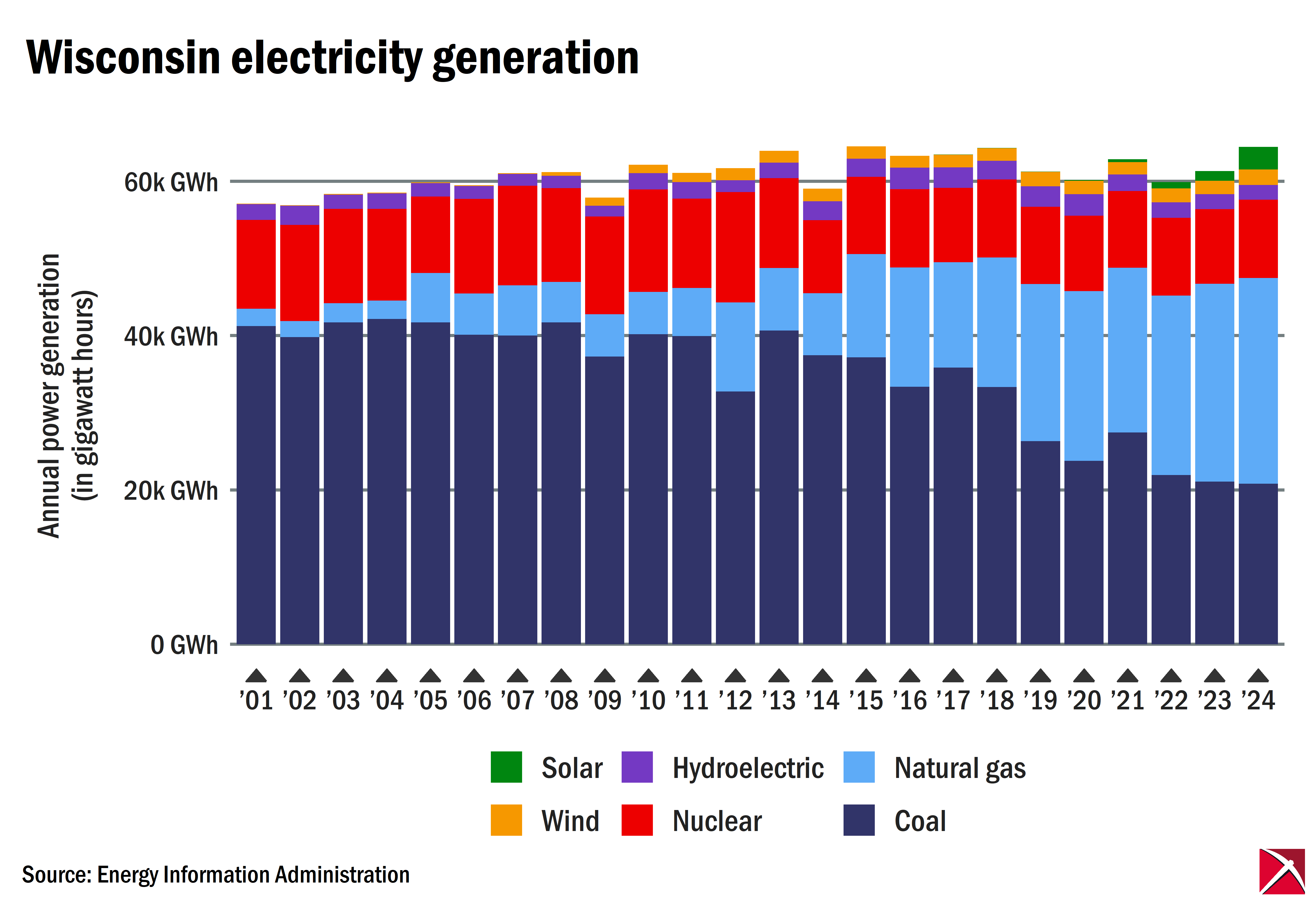 Nuclear energy generation has been largely steady over the period, producing 11,500 GWh in 2001 and 10,100 GWh in 2024. The share dropped when the Kewaunee Power Station was decommissioned in 2013, leaving the Point Beach Nuclear Plant as the state’s only nuclear source.