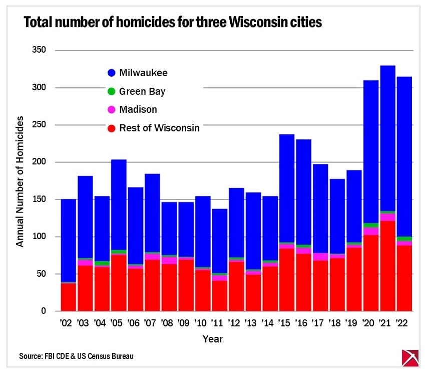 Correction: An earlier version of this story included an erroneous calculation of the City of Milwaukee homicide rate. While the number of homicides in the city was depicted correctly, the calculation used incorrect population figures for the city, leading to an inaccurately low homicide rate for Milwaukee and an inaccurately high homicide rate for the rest of Wisconsin outside of Milwaukee, Madison and Green Bay. The homicide rate graph is now corrected.