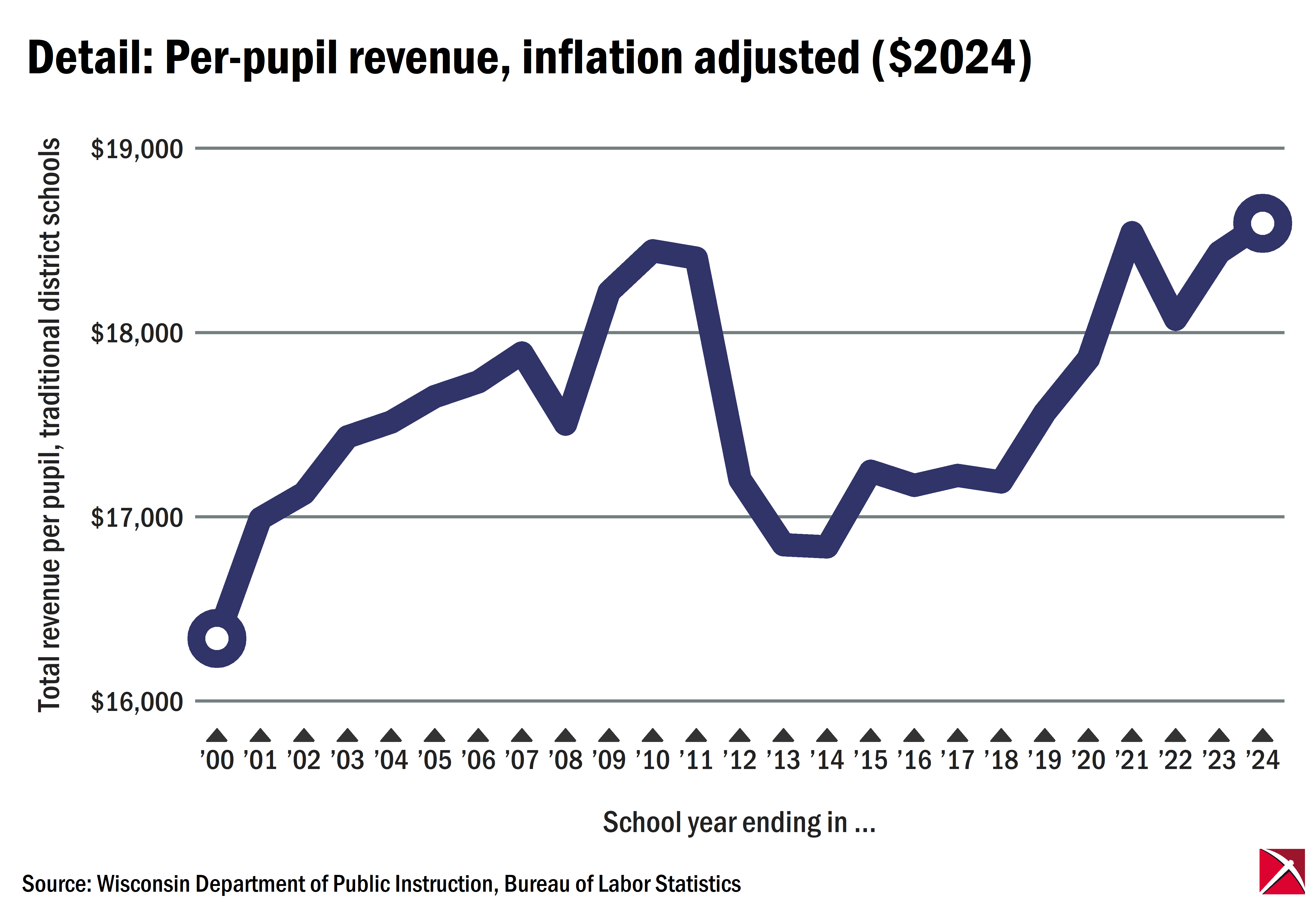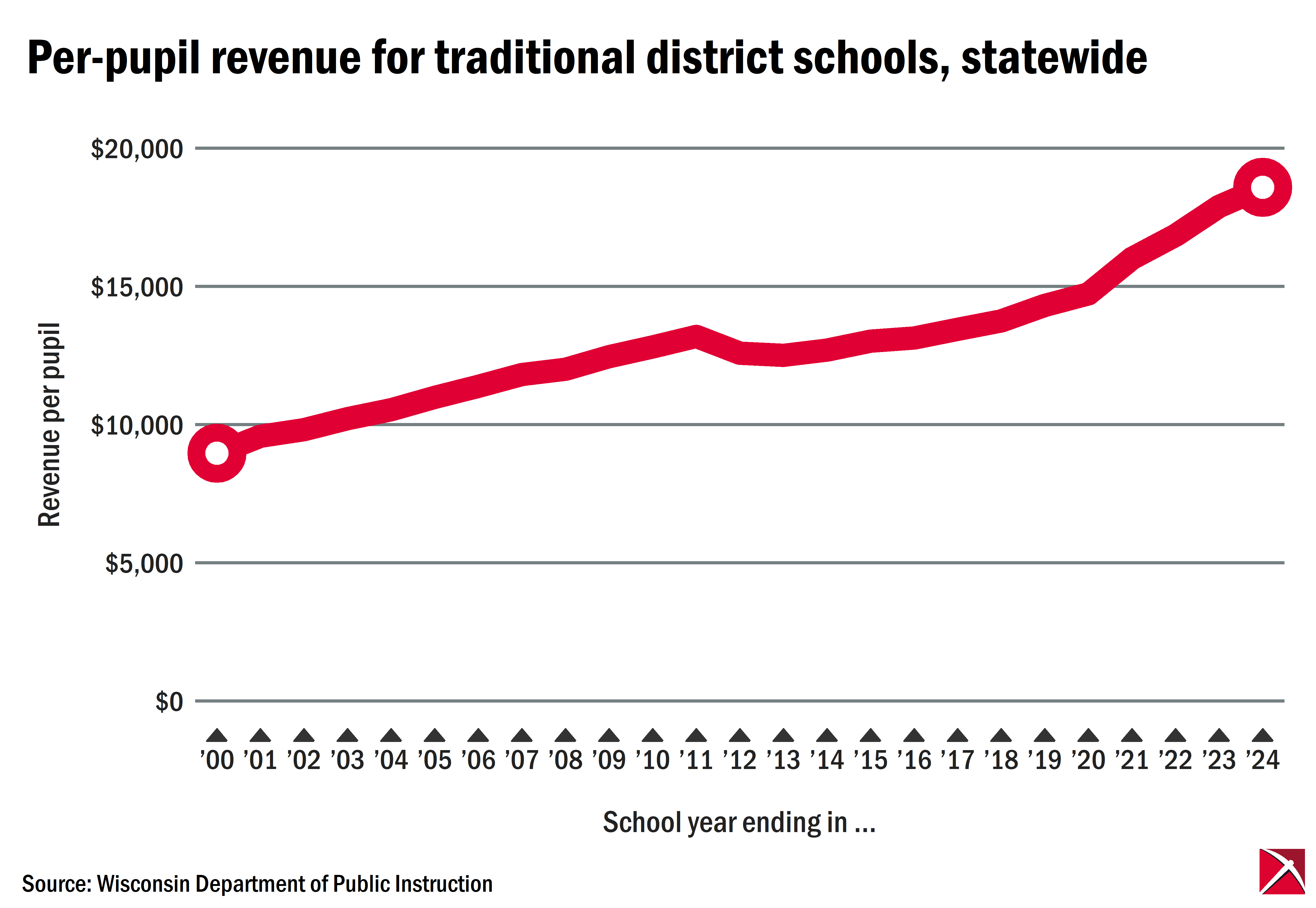 Wisconsin’s district-run public schools had $18,592 of revenue per pupil, an all-time high and more than twice what it was in the school year ending in 2000, according to the most recent figures from the Department of Public Instruction.