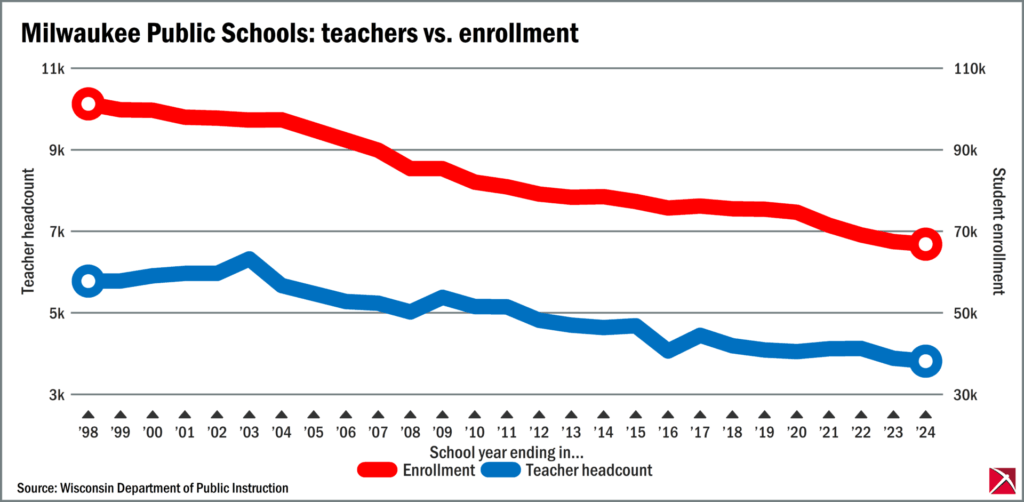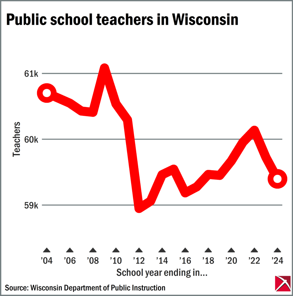 Wisconsin’s public schools are losing students faster than districts are downsizing their staff, analysis of data from the Wisconsin Department of Public Instruction shows.