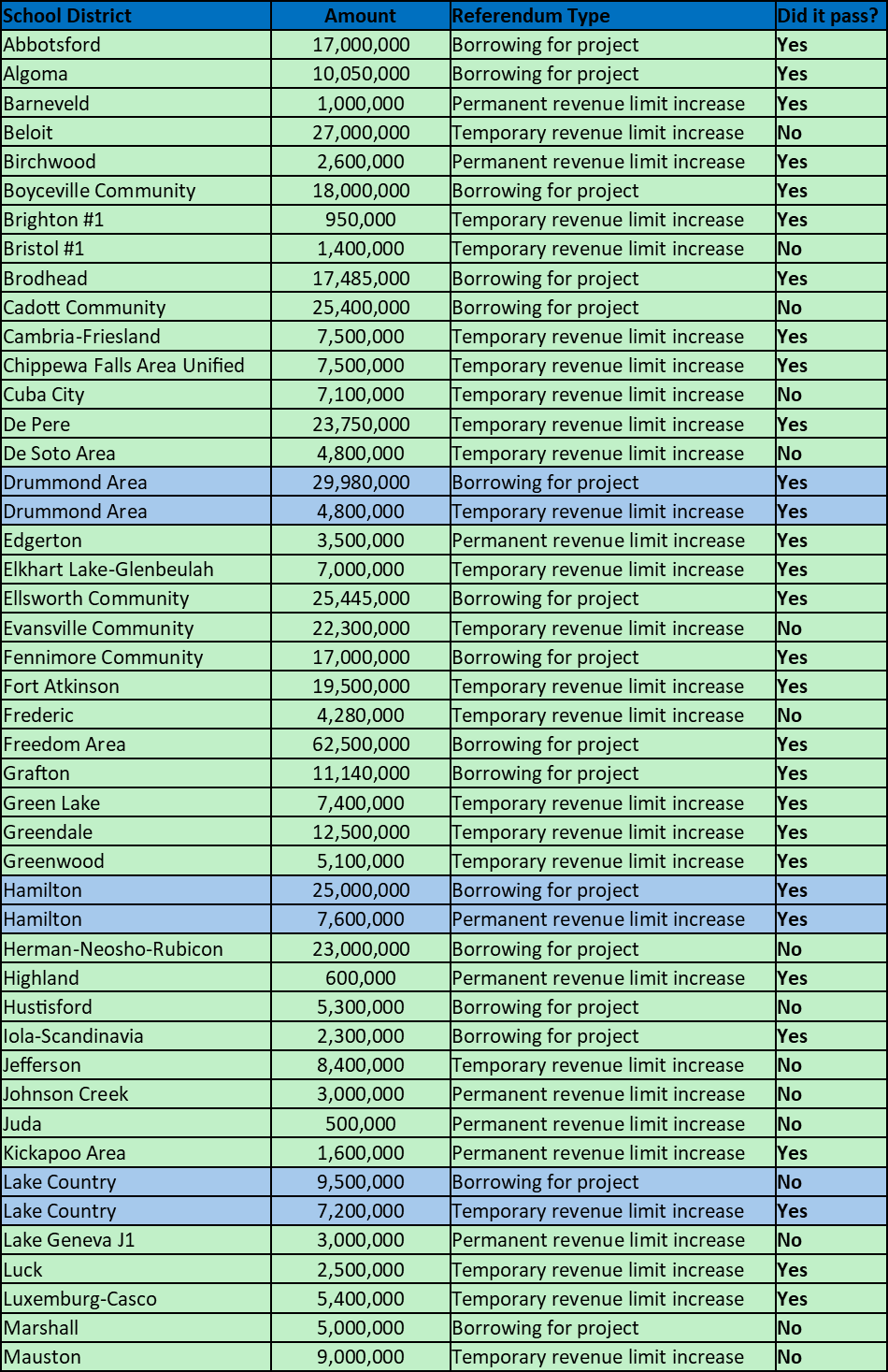 Pass-fail data for Wisconsin’s 2024 spring school referenda
