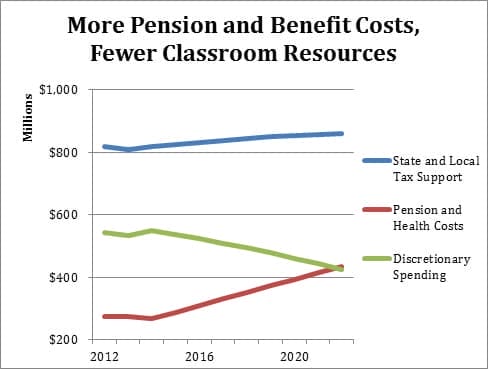 Put another way, over the next 10 years, taxpayers will send more money to MPS, but significantly less money to MPS classrooms. In 2022, taxpayer support for the district is estimated to be $42.4 million higher than it is today, but the district’s discretionary spending (revenue not committed to health and pension costs) will be $118.5 million lower than it is today.